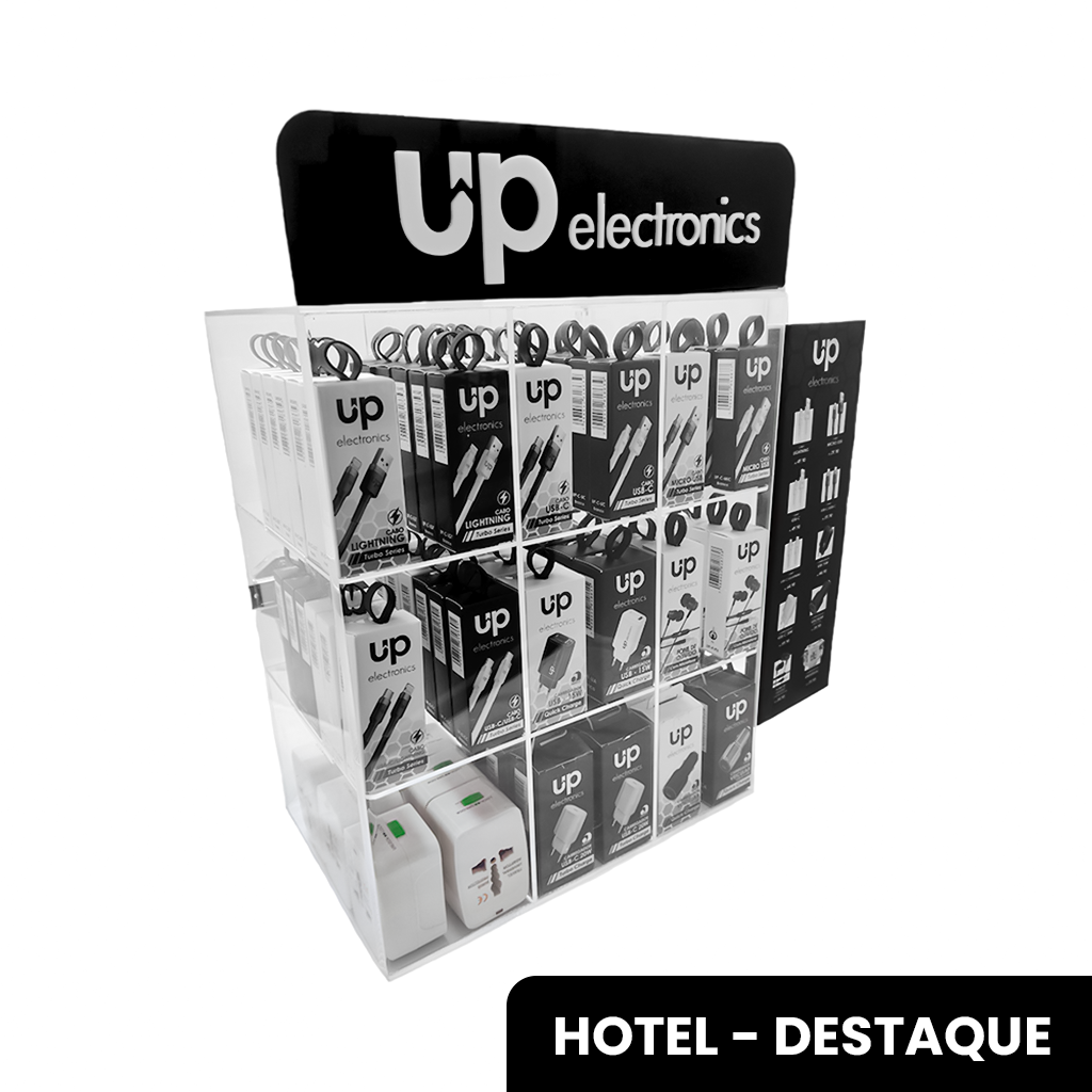 O Kit Display Destaque de Acessórios de Celular para Hotéis da UP Electronics foi desenvolvido para atender as necessidades dos hóspedes com mais conveniência, praticidade e organização. Com design moderno e compacto, este display é ideal para recepção, loja de conveniência ou lounge do hotel, permitindo acesso rápido a acessórios essenciais e agregando valor à experiência do cliente.